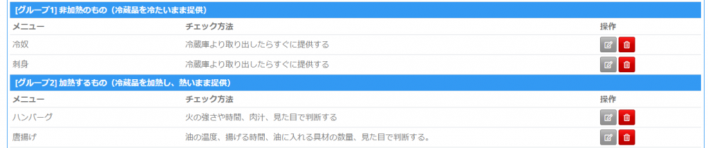 ③メニュー名(料理名または材料名)と、各メニューごとのグループおよびチェック方法を登録します。